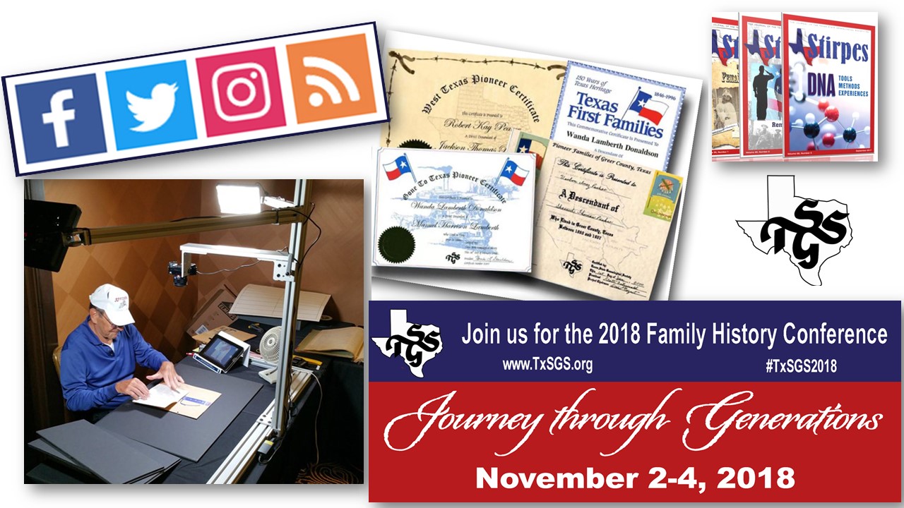 …and save on your conference registration! Not only does your TxSGS membership bring you four issues of our fabulous journal, Stirpes, and discounts to our genealogy conferences, your support of TxSGS through membership has far-reaching effects throughout the world of Texas genealogy. Our statewide genealogical initiatives help Texas genealogists by: