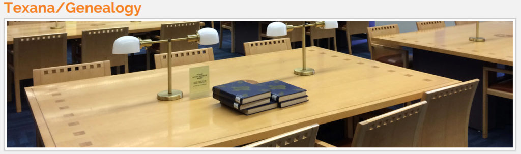 For a more complete description of the Texana/Genealogy Department, see http://guides.mysapl.org/texgen; links to digitized Texana/Genealogy Department materials hosted by the Portal to Texas History are located on this page as well. Texana and genealogy books can be found in the online catalog; however items in the Special Collections, Archive collections, as well and microfilm and microfiche do not appear in the catalog.