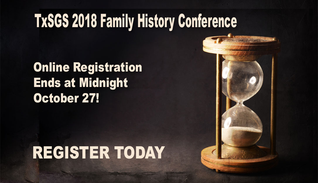 It’s not too late to register for the 2018 TxSGS Family History Conference in San Antonio, November 2-4. Join us to participate in this event featuring 30 speakers presenting 56 sessions and 4 workshops. Visit the Exhibit Hall to learn about the TxSGS Early Texans DNA database project and talk to representatives from FTDNA, Texas GLO (Government Land Office), HV Chapman & Sons book binders, and many more.
