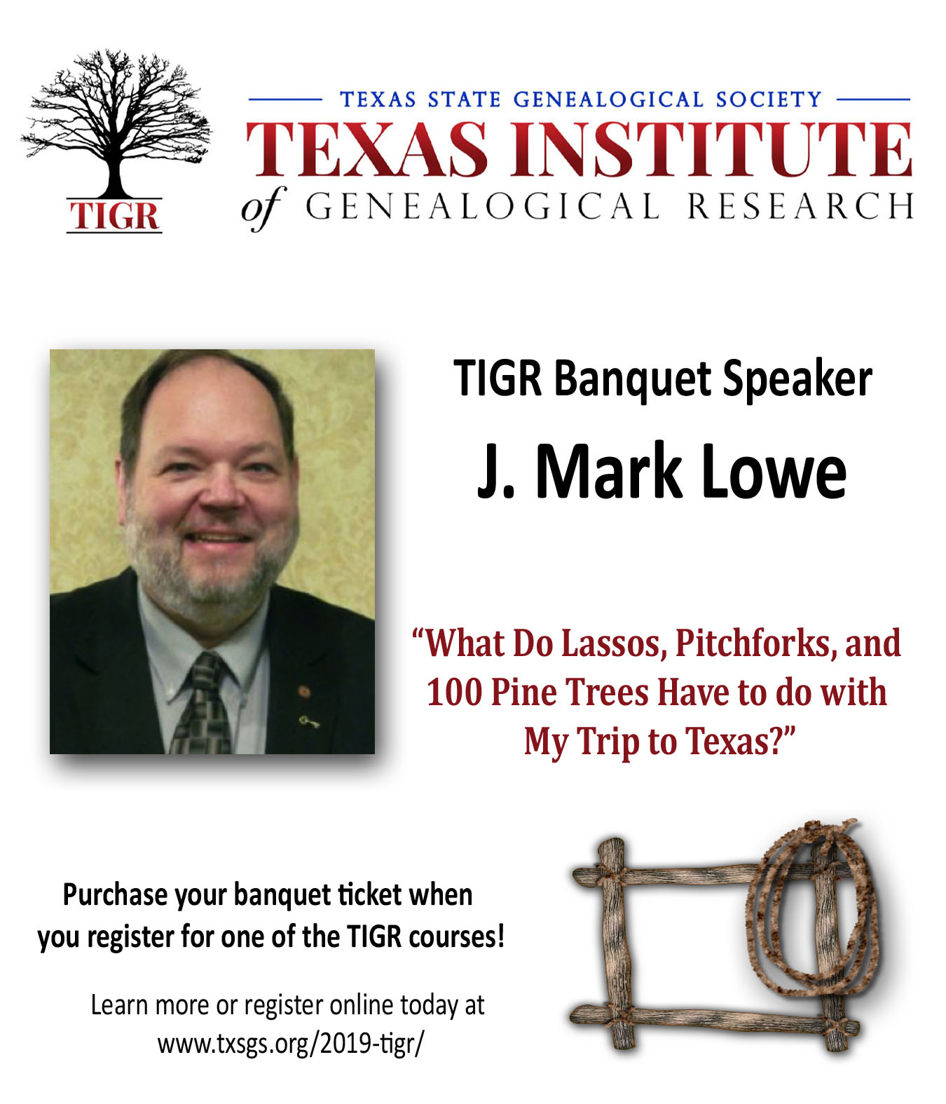 Mark LoweWhat do these things have to do with banquet speaker J. Mark Lowe’s trip to Texas for the 2019 Texas Institute of Genealogical Research?