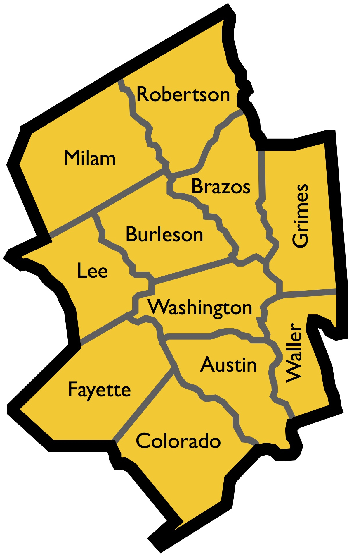 Austin, Brazos, Burleson, Colorado, Fayette, Grimes, Lee, Milam, Robertson, Waller, Washington