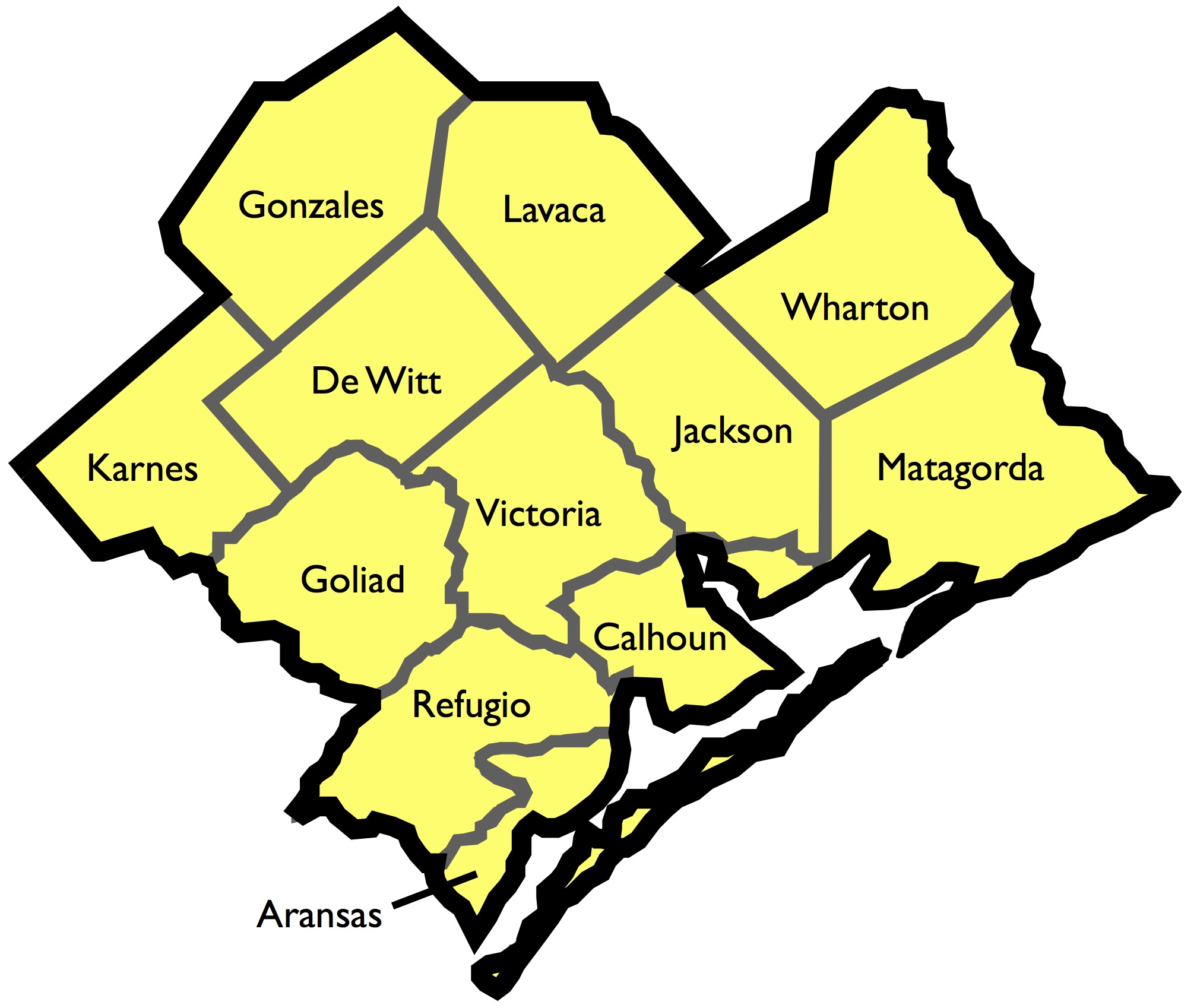 Aransas, Calhoun, DeWitt, Goliad, Gonzales, Jackson, Karnes, Lavaca, Matagorda, Refugio, Victoria, Wharton
