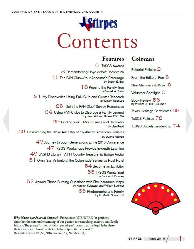 If you have difficulty accessing this issue of Stirpes, please contact either memberinfo@txsgs.org or president@txsgs.org for assistance.