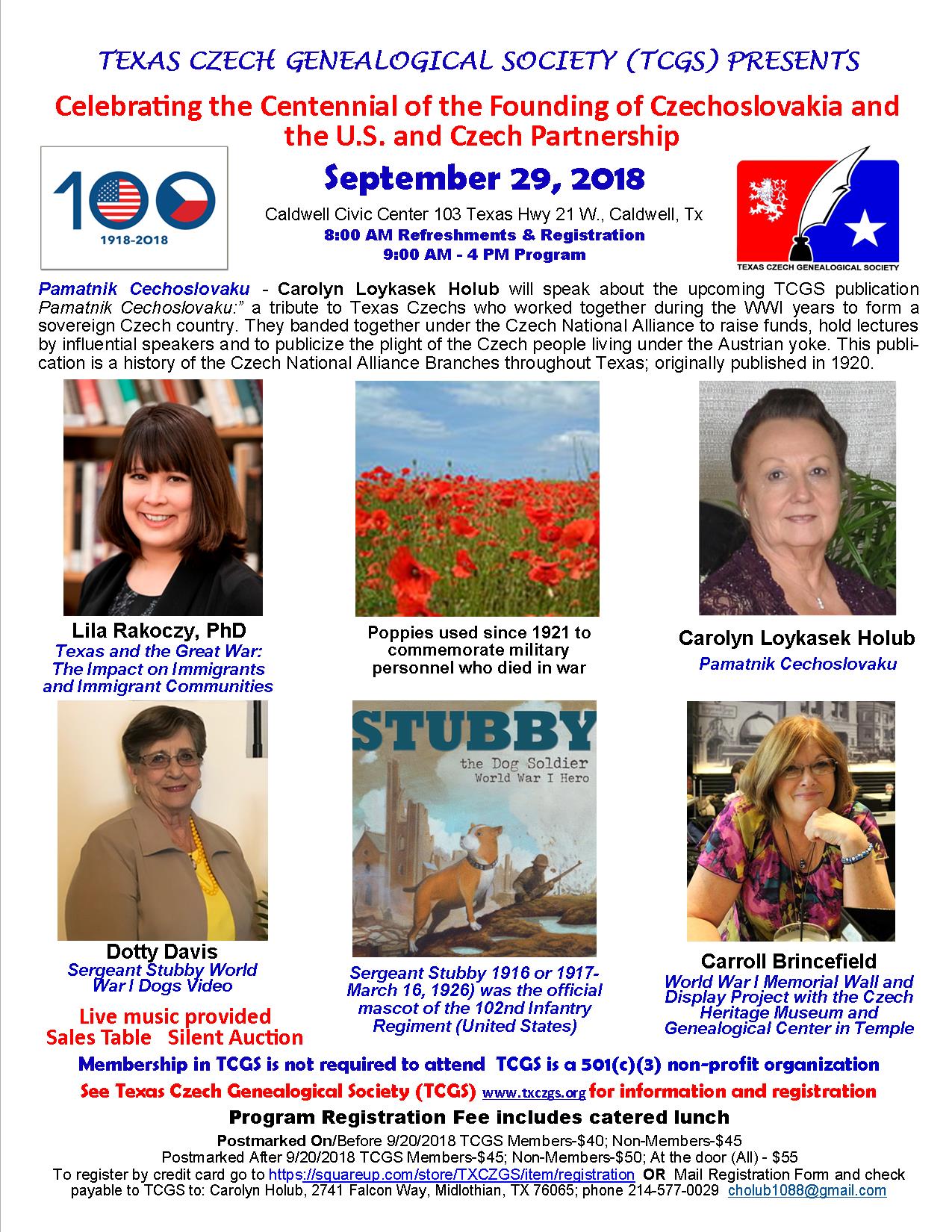 Caldwell Civic & Visitor Center 103 Presidential Corridor, CaldwellCelebrating the Centennial of the Founding of Czechoslovakia and the U.S. Czech Partnership The September 29, 2018 program will honor the 100th anniversary of the founding of Czechoslovakia, the forging of the U.S. and Czech partnership and focus on the Texas Czechs who worked together during the “Great War” (WWI) years to help form a ... Read more