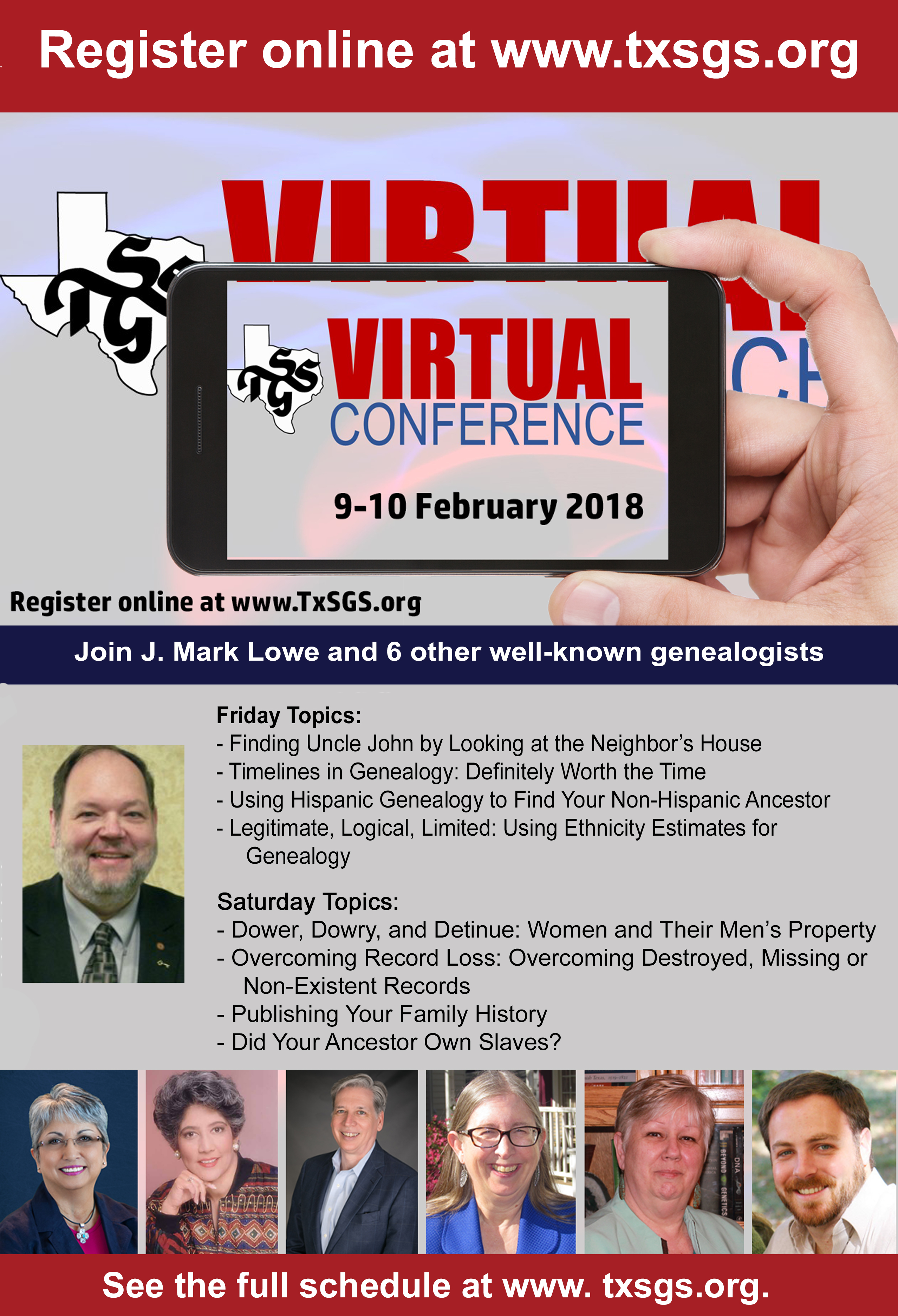 Registration for the 2018 Virtual Conference includes access to the Live event (see: Schedule), a digital syllabus, and ninety-day access to the recorded event. Sessions are being recorded and will be available for a limited time on the TxSGS website. Details about accessing these sessions will be emailed to registrants following the event.